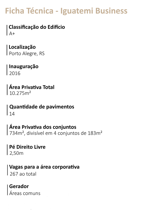 O Iguatemi Porto Alegre possui uma torre corporativa triple A, a Iguatemi Business, inaugurada em 2016. Com 14 pavimentos, suas lajes de 734m² de área privativa podem ser divididas em quatro conjuntos de 183m², sendo o espaço é perfeito para quem deseja promover grandes negócios e valorizar o bem-estar dos seus colaboradores. O complexo também conta com escritórios boutique, no quarto pavimento do Shopping, projetado com paredes envidraçadas e vista para a área interna do ativo.
